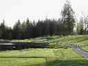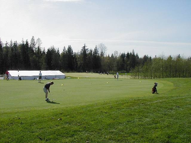 Druids Glen is advertised as the Jewel of the Northwest. Situated in Kent, actually more like Covington and not all that far from Black Diamond, it is tucked away in an area near some newer housing developments, yet the feeling is of being in the wilderness. While in the proximity of newer housing, you will not find any houses to contend with on the course. The course can play as long or as short as you want. Ranging from about 5300 yards from the gold tees up to over 7100 from the blacks. Pick your poison. The nines are contrasting in length, with the front 9 being shorter (about 200 yards). The back nine from the blacks plays a whopping 3657 yards. While there is no real club house yet, one is to be built at some point once they get through the impossible King County permit system. Currently the clubhouse consists of a small structure were they sell some merchandise and have a few tables to sit down. Behind the temporary clubhouse is another structure which contains the rest rooms and a small snack counter where you can buy various munchies, pop as well as beer. There is also a beverage/snack cart that drives around in season selling eats and drinks. The practice range is grass, except when weather dictates that they use range mats on the concrete. About all this does is give you lots of practice on your hanging lies, as these concrete areas aren't level. While the tees are grass, it isn't always groomed tee/fairway grass. I.E. the grass is typically longer, more like hitting out of light rough than even off of of one of the well groomed fairways. Still anything that isn't mats is welcome. There are some target flags and range signs to give you something to shoot at. The general range area has been expanded somewhat but the range is surrounded by long grass left and behind. To the right is the first hole, but it seems to sit far enough away to not cause any real problems. It is still easy to send balls into the thick areas, especially left of the groomed area. There is only one putting/chipping green and it is just to the left of the 1st hole. |