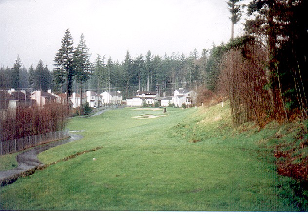 (now the back 9). The course is set among forests, houses and a gravel pit. While trouble abounds the boundries of most holes, the fairways are reasonably wide between the tree lines or houses. You don't feel too constricted as is often the case with other courses in such a setting (as in Lake Wilderness up the road). On the scorecard there are only two sets of tees, blue and read. There are more tee boxes however. Even from the blue tees the course only plays 5724 yards. The main reason I went to Elk Run in February was because it was billed as a dry winter course. I admit I was disappointed in that department. It didn't seem drier than other courses in the area. There was casual water in numerous locations, and even on a green or two. Of course the extra casual water on 18 came after the 10 minute hail storm I experienced on the 16th hole. All too many of the bunkers had big puddles or collections of water though even before the hailstorm. There were also a few areas of standing water than created unnatural water filled depressions. I would not put this in the dry winter course category but I have seen worse (like Auburn). On the good side, mud and plugged shots didn't seem to be as much of a problem. It was just really wet. There is a full clubhouse, restaurant, and sports bar to tickle your fancy either before or after the round. The practice range had a sign over it that said closed until further notice and was rather raggy looking with the back fence sporting a 200 yard sign. It appeared it might be possible to drive a ball over the 200 yard fence and hit people on the 18th tee. Elk Run has a good variety of holes, and length won't be your concern. The longest par 4 is only 364 yards. The par 5's are all under 500 yards, although number 7 at 496 yards plays up a steep hill after the tee shot. This is a good fun little layout where the driver is often best left in the bag in favor of a fairway wood or long iron off the tee. I found myself using driver more than I should have. My two iron generally had better results. |